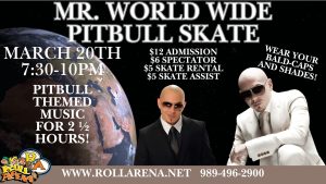 Get ready to party like Mr. Worldwide at Roll Arena! Join us March 20th from 7:30β10:00 PM for a night of skating to 2Β½ hours of Pitbull-themed music. From club hits to party anthems, weβre bringing the energy to the rink!